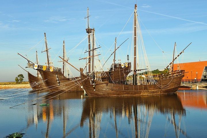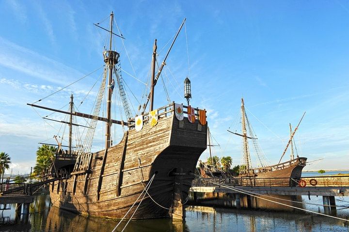 Full day excursion in which we will move to the surroundings of Huelva to know the last steps of Columbus before he left for the first time in search of the new route of the Indies, in which he met the new continent, changing completely the way of life of the Old Europe. During the tour we will visit the Caravel Quay, where the replicas of the three ships that left on Columbus' first voyage are located. In addition to the replicas of the ships, its main tourist attraction, the Muelle de las Carabelas Museum has an interpretation center, the medieval neighborhood (recreated around the dock) and the Isla del Encuentro, where an attempt has been made to recreate the indigenous culture of the Island of Guanahani, the first island on which Christopher Columbus landed on October 12, 1492, which he named San Salvador. Later we will move on to the Monastery of Santa María de la Rábida, where Christopher Columbus stayed, before leaving for the New World from Andalusia, when he was still preparing his project, and here is where Martin Alonso Pinzón is buried, who died a few days after his return from his first voyage. Finally, we will go to the town of Moguer where we will visit the Monastery of Santa Clara. It is the most outstanding Colombian monument in Moguer. Its abbess Ines Enriquez, aunt of King Ferdinand the Catholic, supported the voyage of discovery at court. On the return from the voyage of discovery, Christopher Columbus and the rest of the Moguerians spent the first night in his church, fulfilling the vow made on the high seas when a storm was about to capsize the Niña.